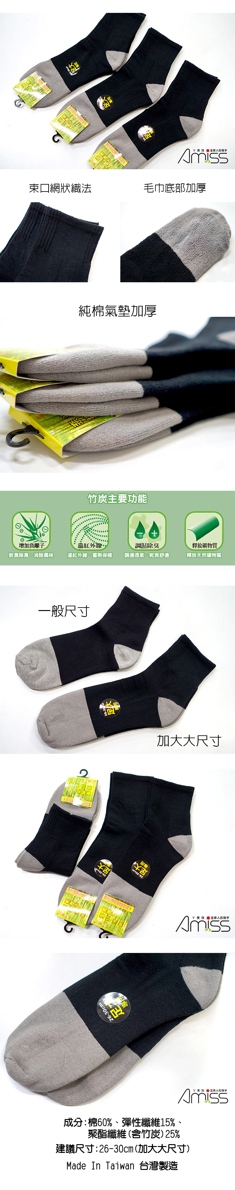 成分:棉60%+彈性纖維15%+聚酯纖維(竹炭紗)25% 尺寸: 27-30cm適穿(腳底參考長度) 台灣製造 清洗時避免過度摩擦,以手洗最佳喔(勿用熱水)